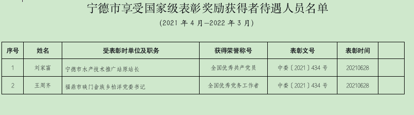 4月11日,福建省人社厅网站公布我省享受国家级、省部级表彰奖励获得者待遇人员名单(2021年4月—2022年3月),其中我市有3人获得。 来源:闽东日报·新宁德客户端记者 张文奎 编辑:陈娥 ...