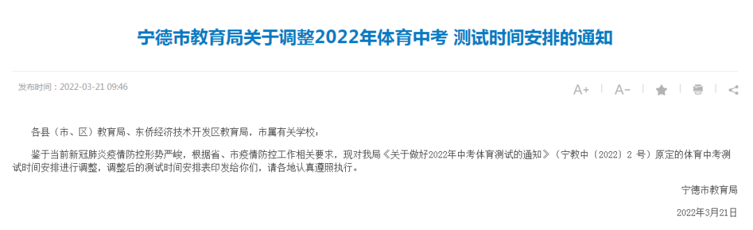 近日,宁德市教育局发布 关于调整2022年体育中考 测试时间安排的通知 详情如下↓ 各县(市、区)教育局、东侨经济技术开发区教育局,市属有关学校: 鉴于当前新冠肺炎疫情防控形势严峻,根据省、...