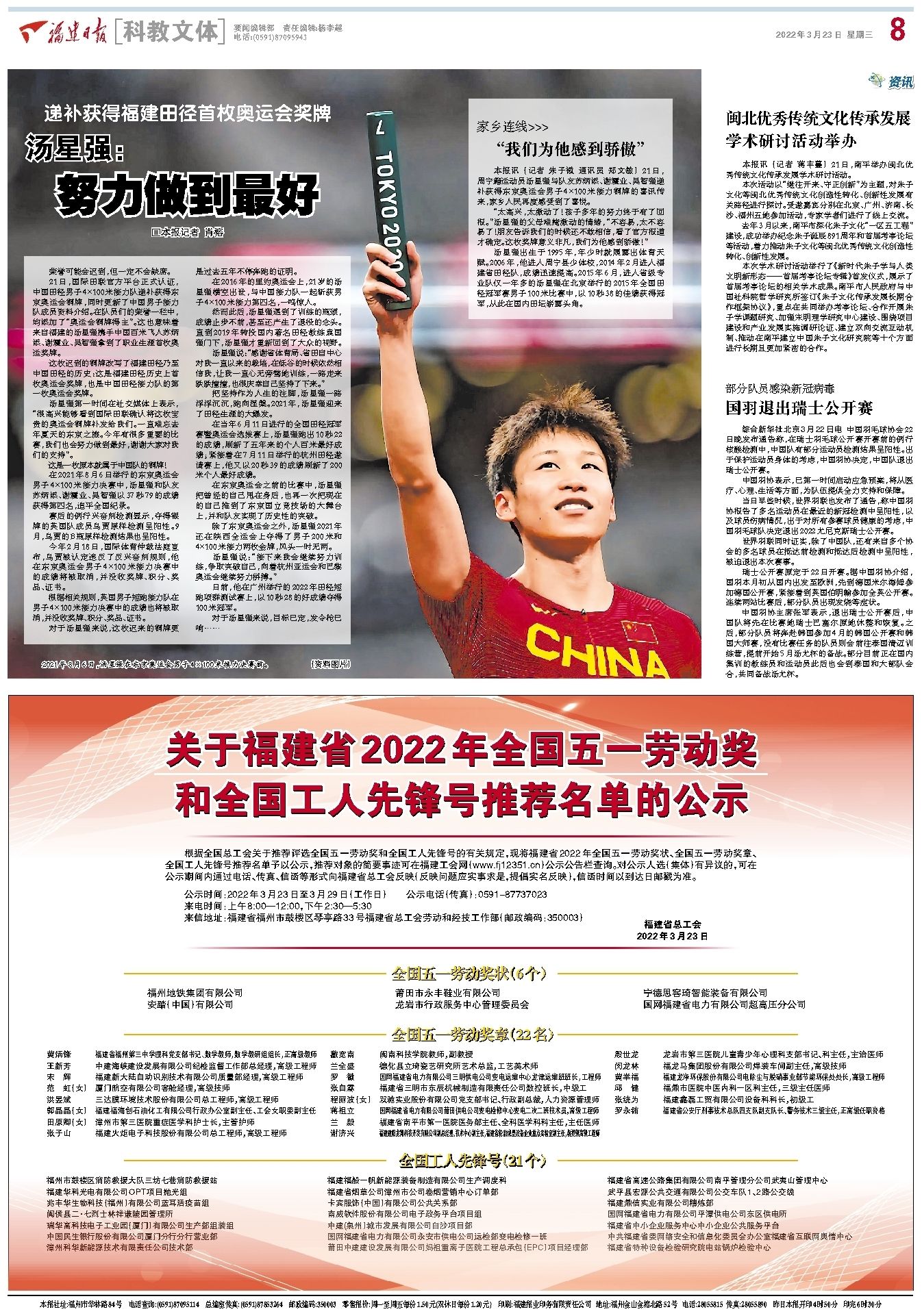 21日,周宁籍运动员汤星强与队友苏炳添、谢震业、吴智强递补获得东京奥运会男子4×100米接力铜牌的喜讯传来,家乡人民再度感受到了喜悦。 “太高兴,太激动了!孩子多年的努力终于有了回报。”汤星...