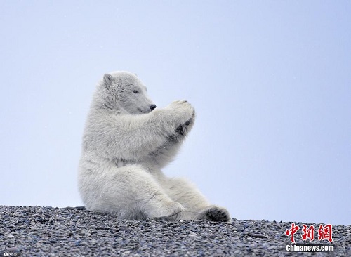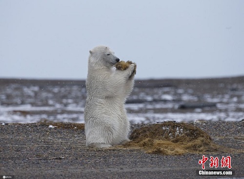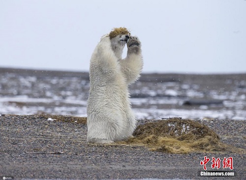 10月12日报道(具体拍摄时间不详),美国阿拉斯加州巴特岛,一只北极熊对海藻好奇不已,它将大量海藻放在头上当“假发”,超有时尚感。图片来源:ICphoto