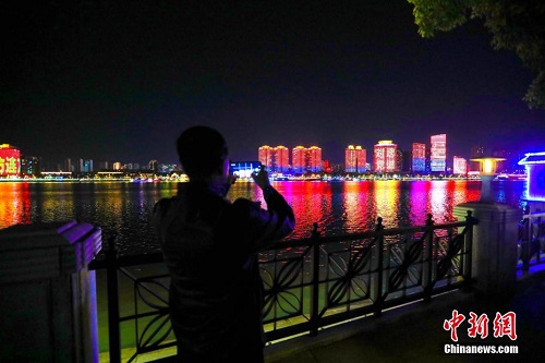 11月9日晚,湖北省襄阳市举办“火焰蓝”消防主题灯光秀活动。当天是“全国消防日”,襄阳汉江两岸标志性建筑整体被点亮,文字及图案融入古城夜景。张岩岩 摄