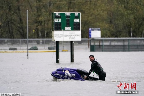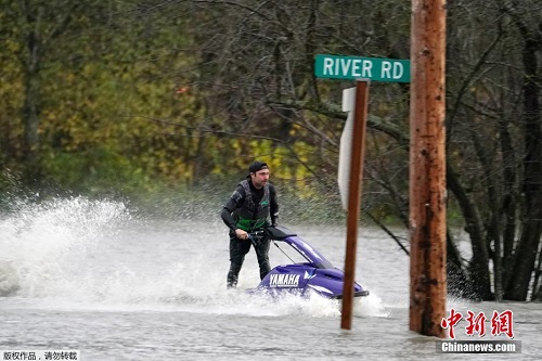 当地时间11月15日,美国华盛顿州Sedro-Woolley,一名男子骑摩托艇行驶在被洪水淹没的街道上。