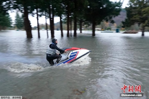 美国华盛顿州路面被淹 民众骑摩托艇出行