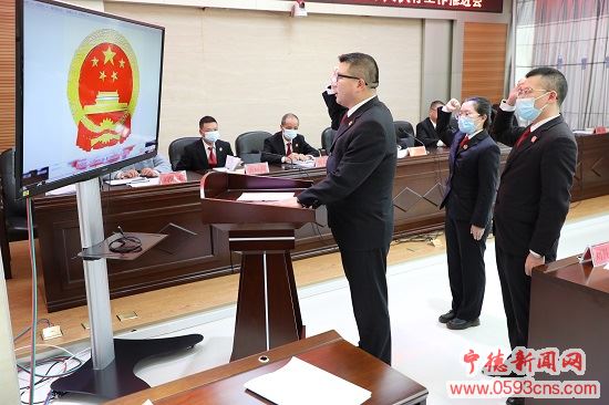 会前,举行了新提任干警宪法宣誓仪式。在全体党组成员的监誓下,在全院干警的见证中,新任党组成员林昌左手抚按《中华人民共和国宪法》,右手举拳进行领誓,新提任干警凌建勇和兰梅珍跟随举拳,庄严跟诵宪法宣誓词。