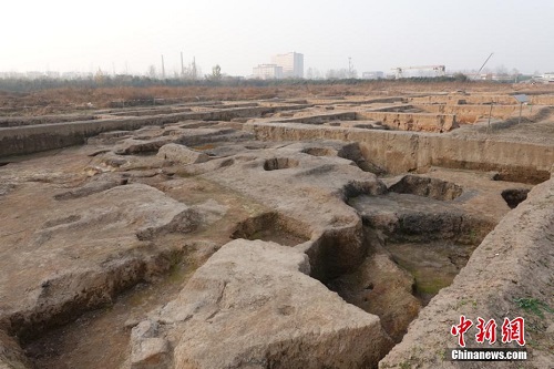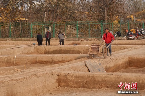 京遗址是西周都城所在地。在位于陕西省西安市沣东新城的镐京遗址,考古人员经过两年发掘,发现了西周大型建筑基址、道路、陶排水管道等重要遗迹,这对研究西周宫室或礼制建筑的分布、建筑技术及都城布局等具有重要意义。图为11月18日拍摄的遗址。 中新社记者 张远 摄