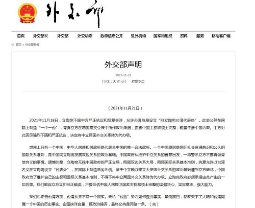中新网11月21日电 外交部21日发表声明指出,2021年11月18日,立陶宛不顾中方严正抗议和反复交涉,允许台湾当局设立“驻立陶宛台湾代表处”。此举公然在国际上制造“一中一台”,背弃立方在两国建交公报中所作政治承诺,损害中国主权和领土完整,粗暴干涉中国内政。中方对此表示强烈不满和严正抗议,决定将中立两国外交关系降为代办级。