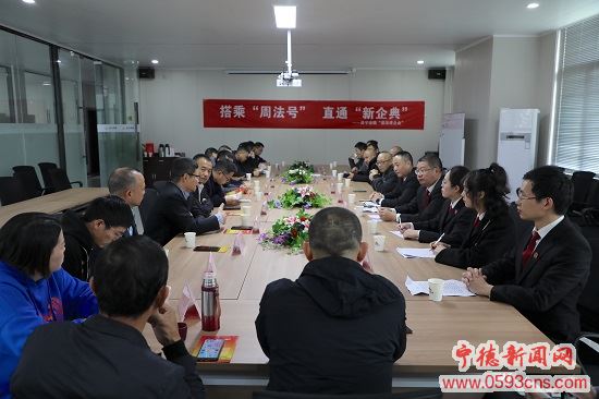 宁德新闻网11月26日电 (郑树泉)为进一步帮助民营企业防范法律风险、维护合法权益、化解矛盾纠纷,营造良好的法治化营商环境,近日,由周宁县人民法院党组书记、代院长陈立峰带队,联合县总工会、人社局、市场监督管理局组成“法治体检团”,来到周宁县不锈钢深加工产业园内,对入驻园区的三十余家企业进行“法治体检”。