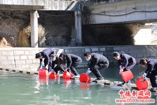活动现场,法院干警们在霍童溪周宁段开展增殖放流科学放生净水鱼苗活动,本次活动共投放鱼苗3万余尾,为霍童溪注入“新鲜血液”。