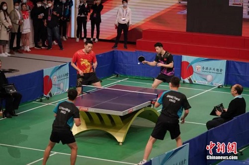 乒乓球运动员马龙与许昕和香港运动员配对表演。 中新社记者 张炜 摄