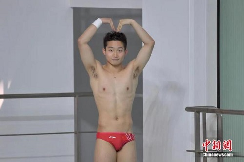 跳水运动员王宗源向观众做出心形手势。 中新社记者 李志华 摄