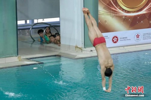 跳水运动员王宗源进行跳水示范及表演,吸引参与表演的香港运动员认真观看及学习。 中新社记者 李志华 摄