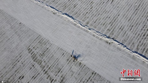 12月4日,黑龙江省哈尔滨市,松花江上的采冰工作已经启动,工作人员在江面用切割机横、竖切割,一块块采冰场地,满是规整的横竖线条。工人会沿着这些横竖切割线,把冰切开,运到冰雪大世界等用冰场地,建设冰景。图片来源:ICphoto