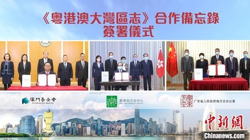 中新网香港12月6日电 (记者 张晓曦)香港地方志中心、澳门基金会、广东省地方志办公室三方6日以视频方式签署《粤港澳大湾区志》合作备忘录。香港特区行政长官林郑月娥、澳门特区行政长官贺一诚、广东省省长马兴瑞见证了签署仪式。