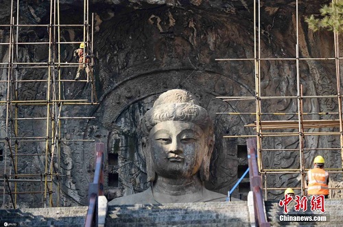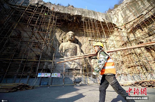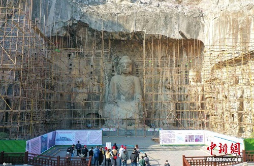 12月6日,河南省洛阳市,龙门石窟奉先寺大型渗漏水治理和危岩体加固保护工程启动。据悉,这是20世纪70年代奉先寺进行保护修复工程以来,首次进行的大型保护工程。图片来源:ICphoto