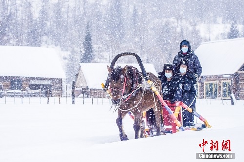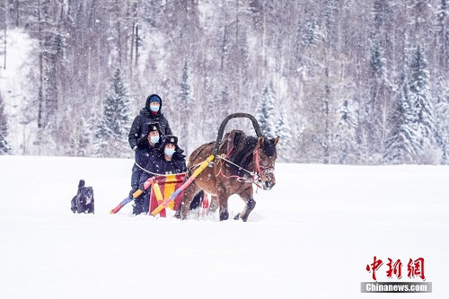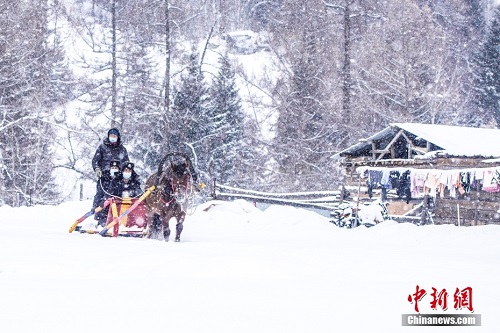 12月8日,民警和护边员搭乘马拉爬犁开展辖区走访工作。连日来,新疆阿勒泰地区普降大雪,喀纳斯旅游风景区积雪厚度普遍达到1.5米以上。针对大雪天气造成道路封闭的现状,当日,新疆出入境边防检查总站阿勒泰边境管理支队喀纳斯边境派出所的民警和护边员利用马拉爬犁开展日常辖区走访工作。中新社发 李铭骥 摄 图片来源:CNSPHOTO