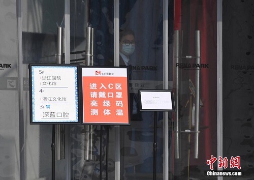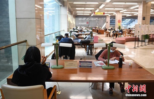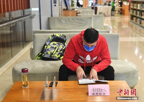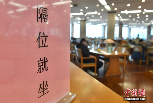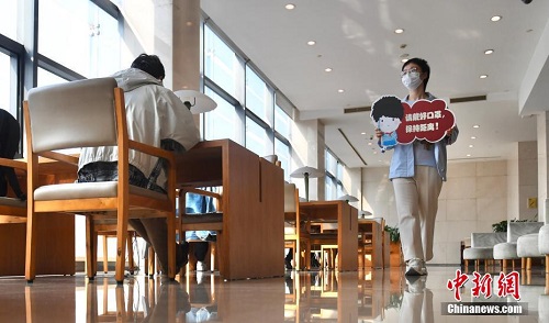12月10日,杭州图书馆工作人员在自习区展示防疫提示标语,该馆目前实行读者进馆限流措施。近日,浙江杭州拱墅、滨江、上城等多个县(市、区)实施公共活动限制性措施,通过关闭棋牌室、酒吧等室内密闭公共场所,以及限制博物馆、图书馆等公共场所接待人数等措施,防止公众交叉感染,阻止病毒传播。 中新社记者 王刚 摄