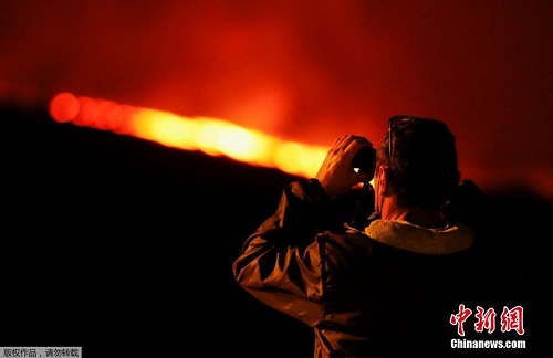 西班牙火山持续喷发 岩浆喷涌而出场面壮观