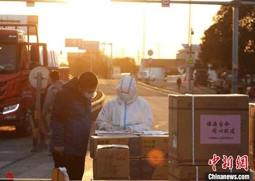 13日,三辆载满物资的货车缓缓驶进镇海与江北交界处,卸下了一大批防疫物资。在防疫卡口,一箱箱贴着“镇海台企、同心抗疫”标语的防疫物资经过清点和查验后被运上货车,第一时间运至了防疫一线。