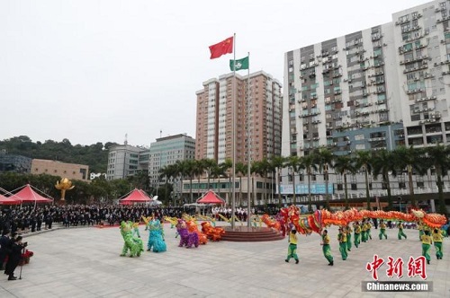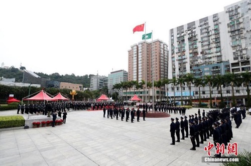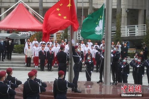 中新社澳门12月20日电 (记者 陈小愿)澳门特别行政区政府20日在金莲花广场举行隆重的升旗仪式,庆祝澳门回归祖国22周年,正在澳门进行交流活动的内地奥运健儿代表团参加了仪式。