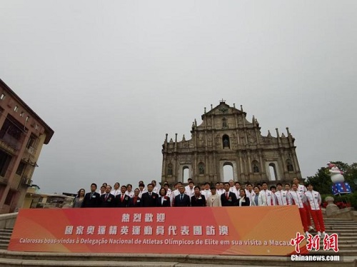 12月20日,内地奥运健儿访澳代表团参访大三巴牌坊,合影留念。 中新社记者 陈小愿 摄