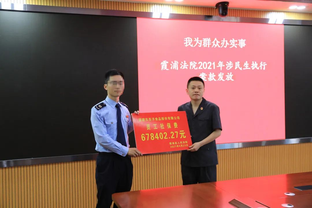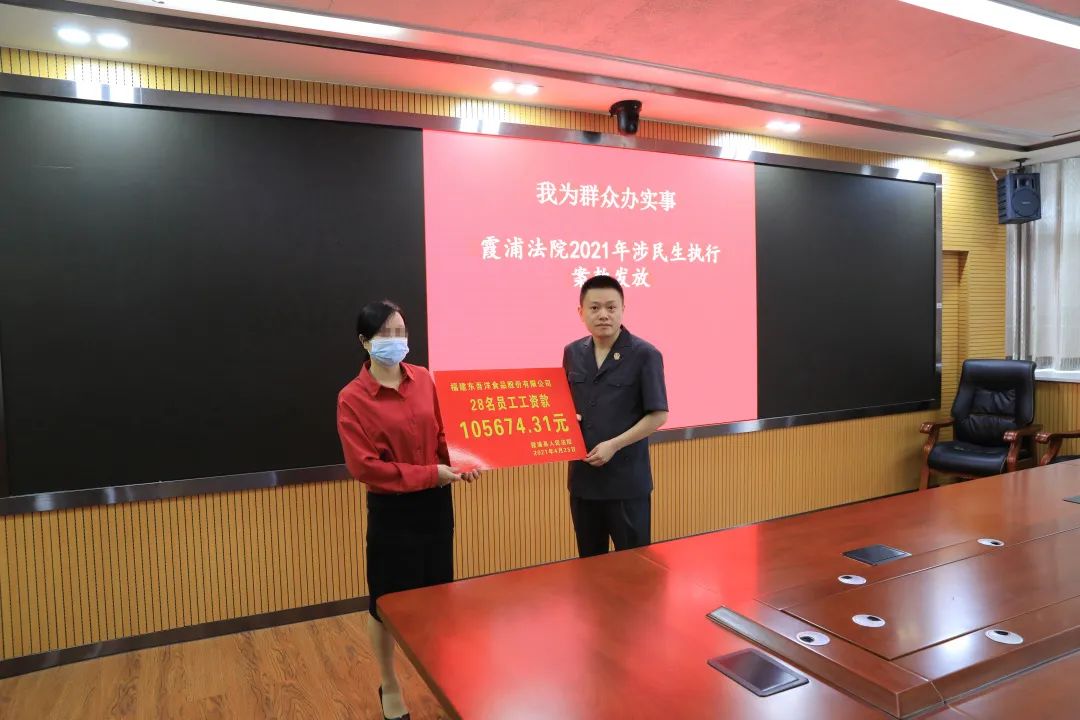 霞浦法院向申请执行人集中发放32笔案款,合计81万余元,其中福建东吾洋食品股份有限公司执行系列案30笔案款,刑事附带民事赔偿纠纷案1起,劳动争议纠纷1起。