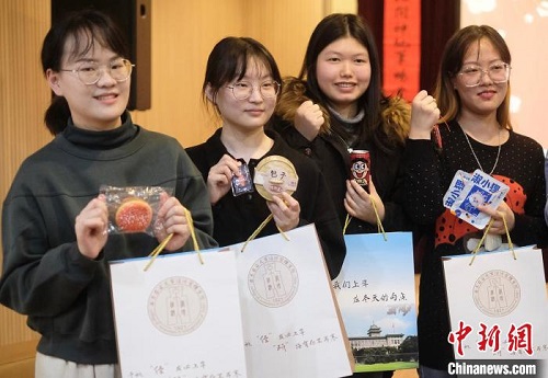 考研学生获赠暖心大礼包,里面装有解压小玩具、暖宝宝、小福袋、薄荷糖等物品。 泱波 摄