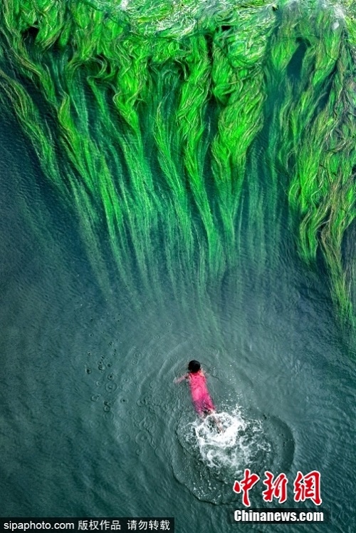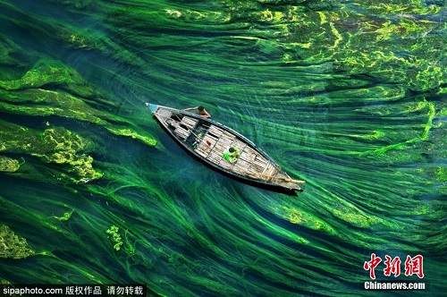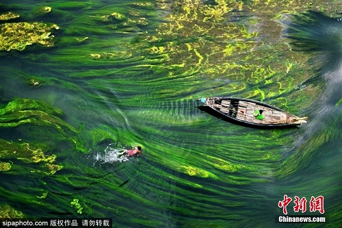12月22日消息,孟加拉国,人们在班加利河上泛舟游泳,碧绿色的水草随河水摇曳,美如画境。图片来源:Sipaphoto版权作品 禁止转载