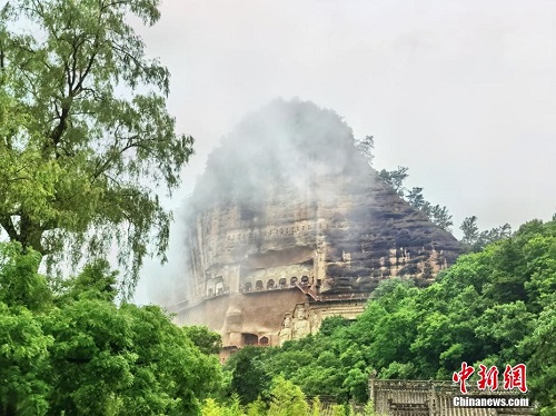 近日,甘肃省文化和旅游厅推出系列冬春“丝路游”攻略与优惠政策。敦煌莫高窟、嘉峪关关城、麦积山石窟等7处世界文化遗产均推出半价、套票等大幅打折优惠政策,其中敦煌莫高窟执行半价门票优惠,参观洞窟增加到12个。旅行社组团游览敦煌鸣沙山·月牙泉、雅丹国家地质公园、玉门关等景区执行门票“10免4”优惠政策。图为笼罩在烟雨中的天水麦积山石窟。(资料图) 陈冶平 摄
