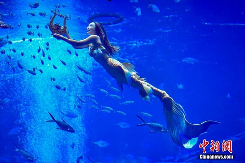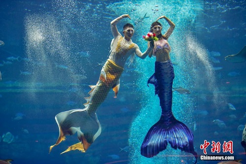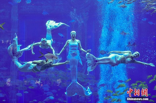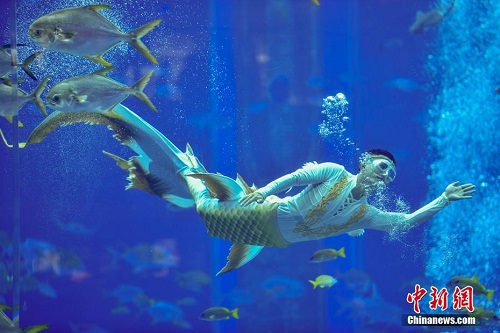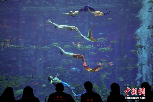 12月21日,首届中国美人鱼表演赛在海南三亚开赛。据了解,本次表演赛设有男子单人、女子单人和四人团体三个项目,共有41名选手参加个人组与团体组的比赛。图为参加团体项目的选手正在比赛中。 中新社记者 骆云飞 摄