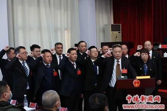 12月18日,周宁县第十八届人民代表大会第一次会议选举陈立峰同志为周宁县人民法院院长。当选后,陈立峰在大会现场进行宪法宣誓。(文/图 郑树泉)