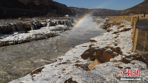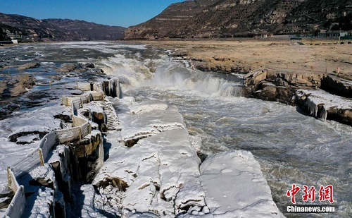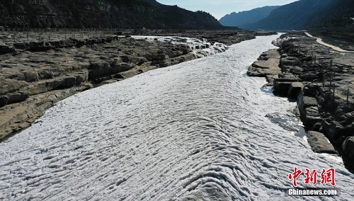12月27日,在山西吉县黄河壶口瀑布拍摄的“流凌叉桥”景观。近日,受寒潮天气影响,黄河中游晋陕峡谷流凌密度持续增大,大量的冰凌在壶口瀑布下游十里龙槽互相凝结粘连在一起,形成“流凌叉桥”的奇特景观。 中新社发 吕桂明 摄 图片来源:CNSPHOTO