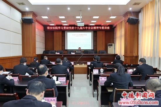 宁德新闻网1月7日电 (林婧雯)为深入学习宣传贯彻党的十九届六中全会精神,确保全院干警始终政治立场坚定,政治方向正确,1月7日,福安法院邀请中共宁德市委党校专家组成员、副教授谢岩福作专题辅导。讲座由院党组成员、政治部主任、机关党委书记阮明霞主持。