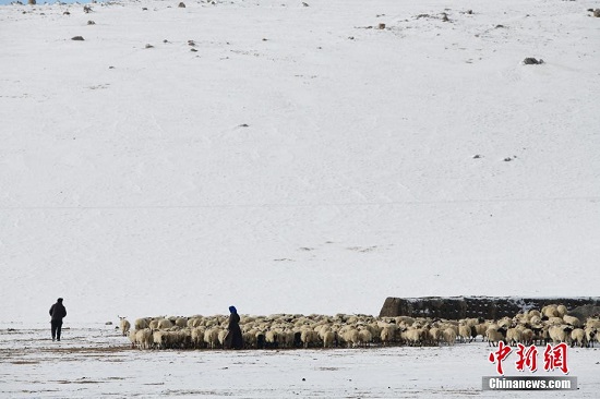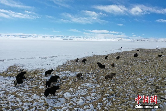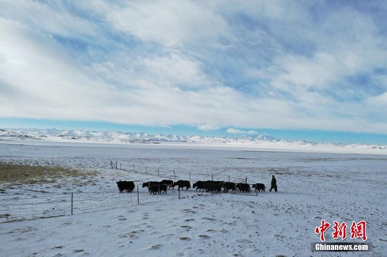 1月26日,牧民在纳木错湖边放牧。雪后的西藏纳木错银装素裹,美景如画。中新社记者 贡嘎来松 摄