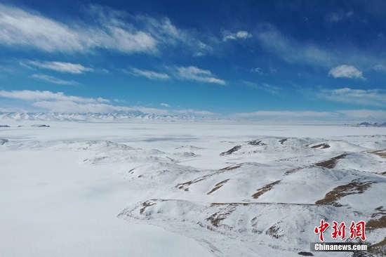 1月26日,纳木错雪景。雪后的西藏纳木错银装素裹,美景如画。(无人机照片)中新社记者 贡嘎来松 摄