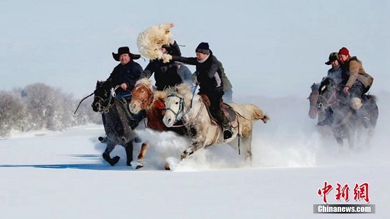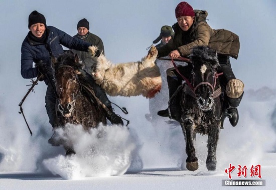 广阔无垠的草原,白雪皑皑,刁羊比赛如火如荼。李文武 摄