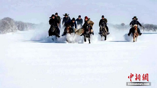 骏马茫茫雪海中狂奔,比赛考验着牧民的力量和毅力。李文武 摄