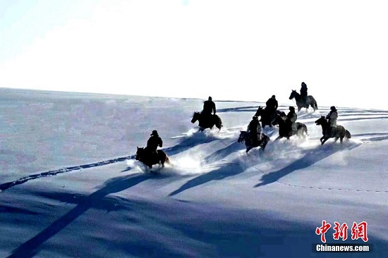 牧民你追我赶雪中驰骋扬鞭争夺。李文武 摄