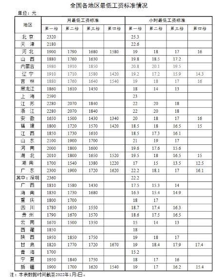 全国各地区最低工资标准情况(截至2022年1月1日)。来自人社部网站