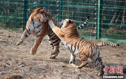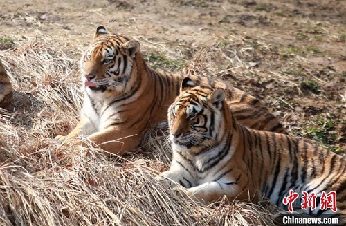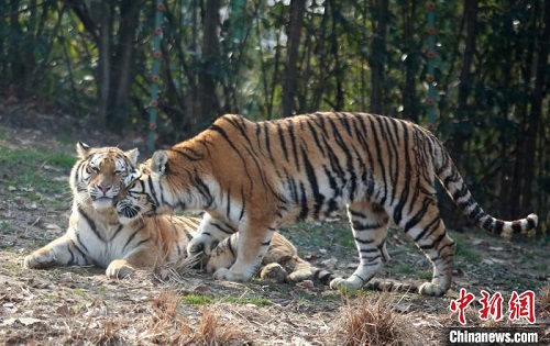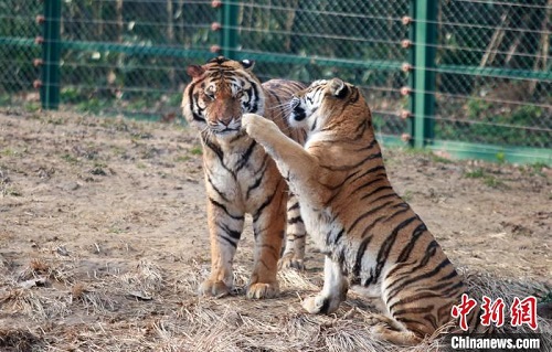 1月30日,农历虎年新春将至,扬州市动物园的东北虎沐浴冬日阳光,互相亲昵玩耍,为虎年春节增添节日气氛,吸引民众拍照留影。