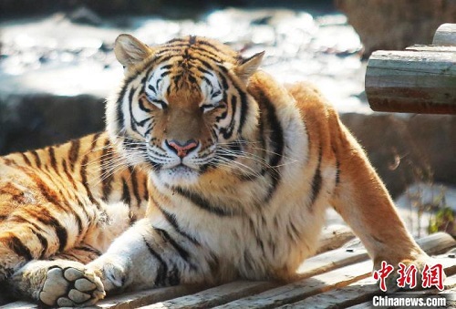1月30日,扬州市动物园的东北虎卖萌憨态迎新春。 孟德龙 摄