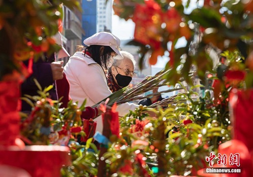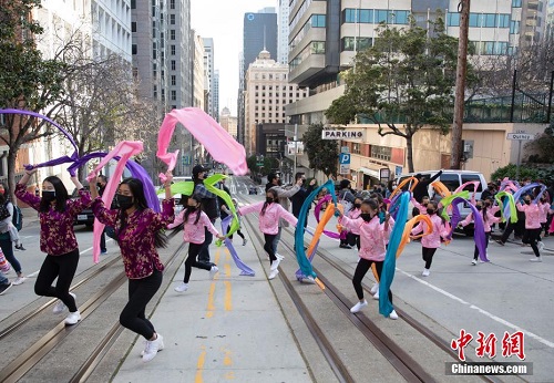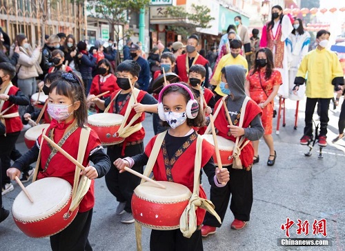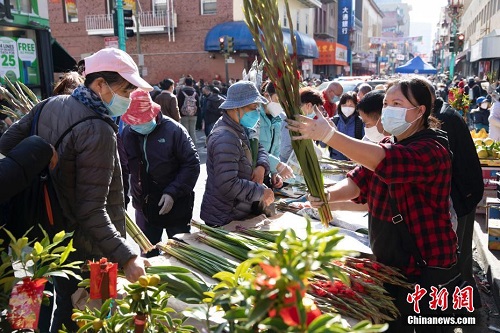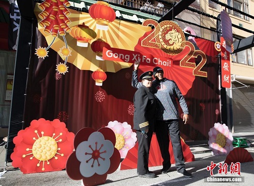 当地时间1月29日,市民在美国旧金山唐人街春节花市上与新年主题装置合影。在一年一度的旧金山唐人街春节花市上,市民不但能购买到各种节日用品,还可以欣赏到舞狮、舞扇以及杂技等中国民俗表演。2021年,旧金山唐人街春节花市因新冠疫情而取消。