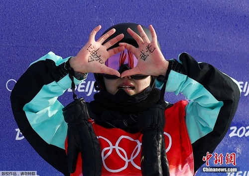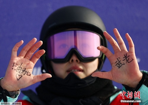 2月10日,北京冬奥会单板滑雪女子U型场地技巧决赛第一轮中,率先出场的中国队选手邱冷完成动作后,亮出手掌里写给队友的话:老武,加油。她的队友武邵桐在2月9日的资格赛中遗憾未能晋级。