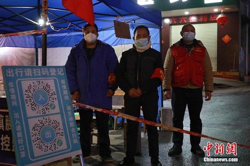 2月11日晚,广西百色市德保县,当地志愿者在夜间值守。当日,广西百色市新冠肺炎疫情防控新闻发布会通报称,广西百色本轮疫情正处于控制关键期,当地从严从速从细从实切断疫情传播链条,坚决遏制疫情蔓延扩散。 王伟臣 摄