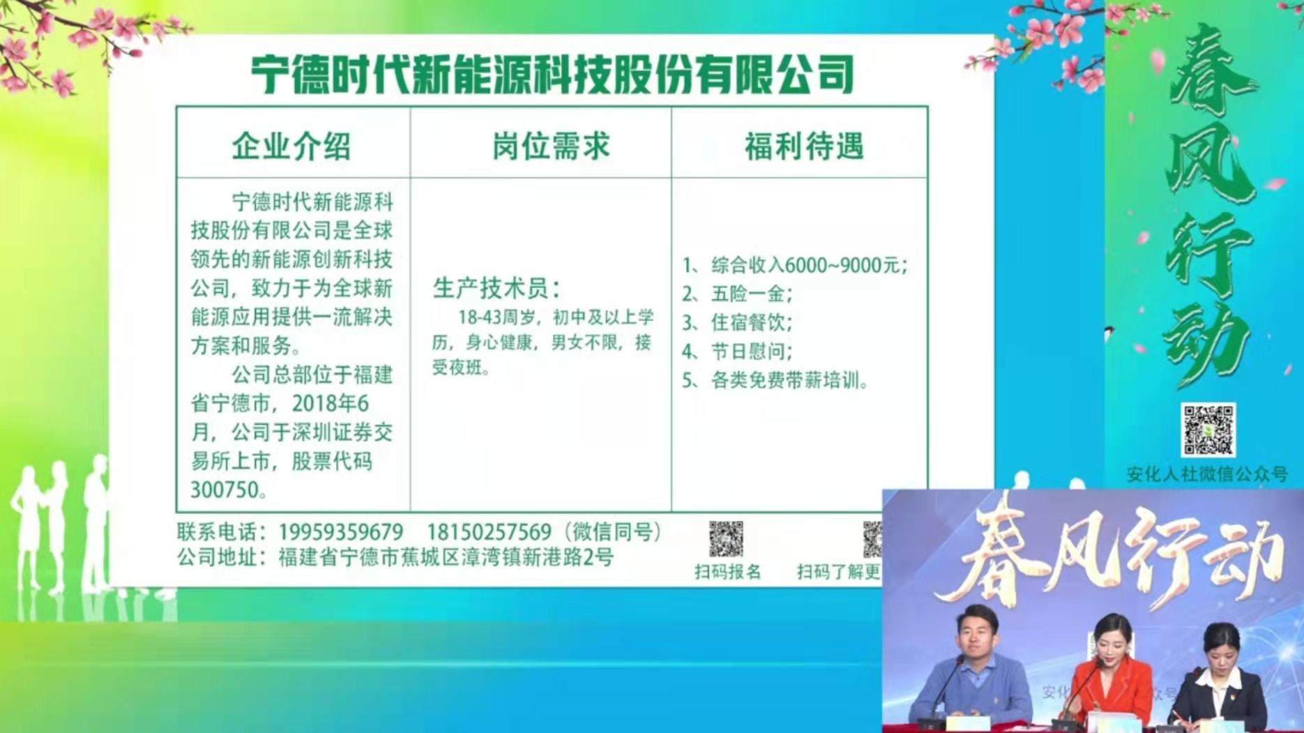 春节过后是企业用工招聘和人才求职就业的黄金期。为打造“就业无忧城市”,吸引更多省外务工人员来宁就业,保障辖区企业节后复产复工,迎接开门红,东侨企业用工服务专班积极抢抓人才招引先机,聚焦企业发展需求,落实疫情防控常态化要求,继2月8日至9日赴河南建立闽豫合作之后,立即于10日携辖区重点企业赴湖南省安化县开展跨省劳务合作洽谈,签订两地劳务合作协议,并联合举办本次线上带岗直播招聘活动。本次直播带岗活动主题是“春风送温暖,就业送真情”,活动由安化县电视台提供技术支持,东侨开发区人社局、安化县人社局、安化县总工会等多部门联合开展,共有宁德时代新能源科技股份有限公司、宁德新能源科技有限公司等5家宁德市重点企业与62家湖南省企业共同参与,提供上万个就业岗位。