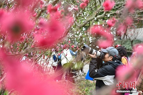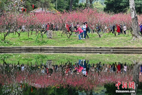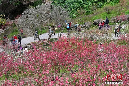 2月13日,广东省广州市,白云山桃花涧盛放的桃花吸引游客踏青赏花。 中新社记者 陈骥旻 摄