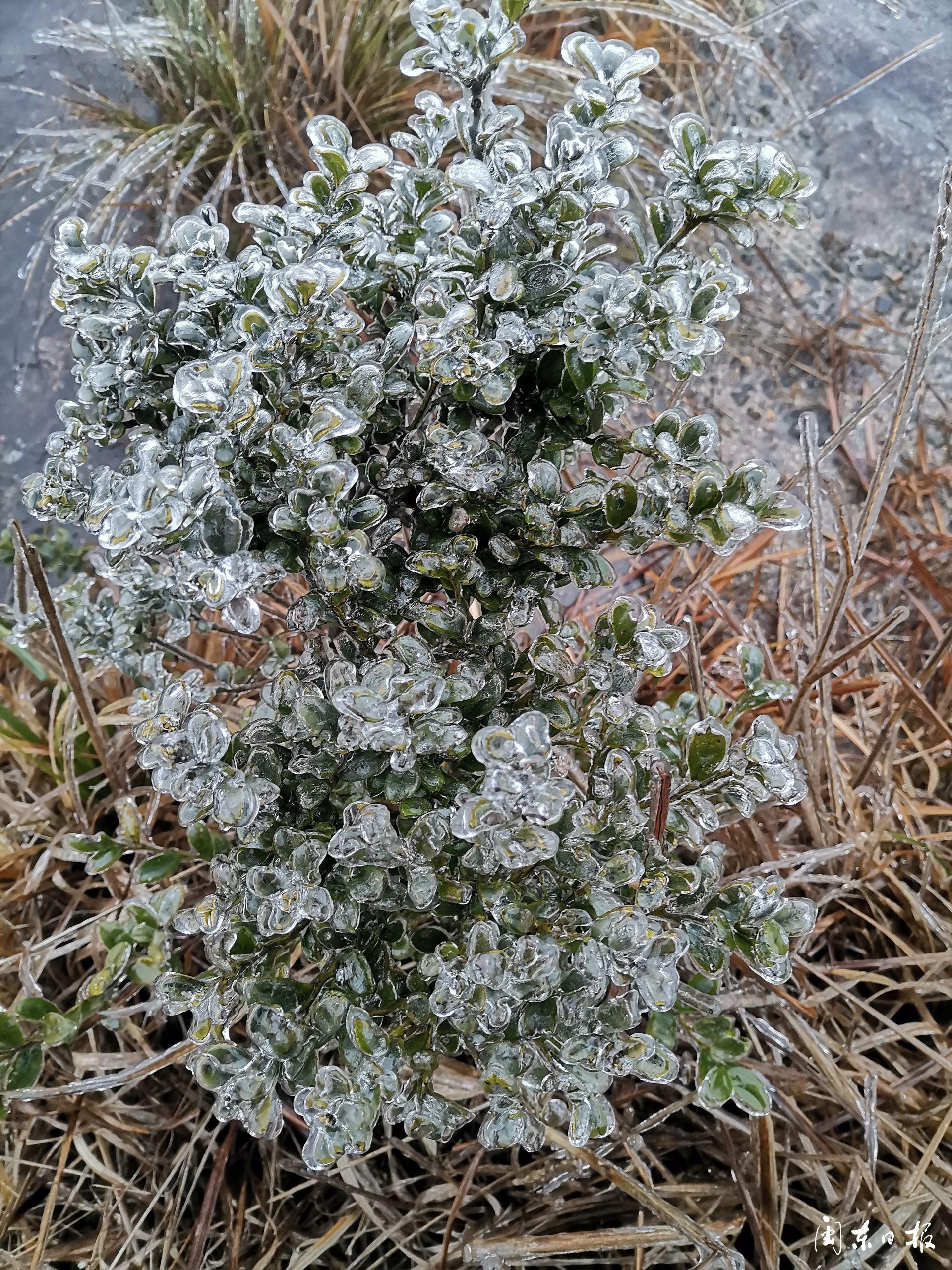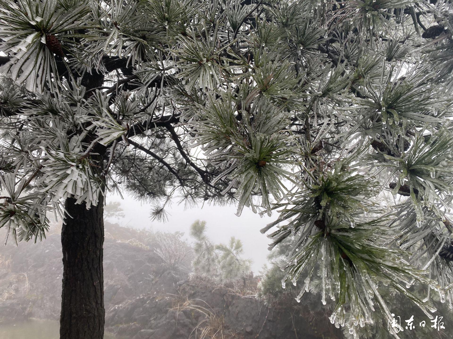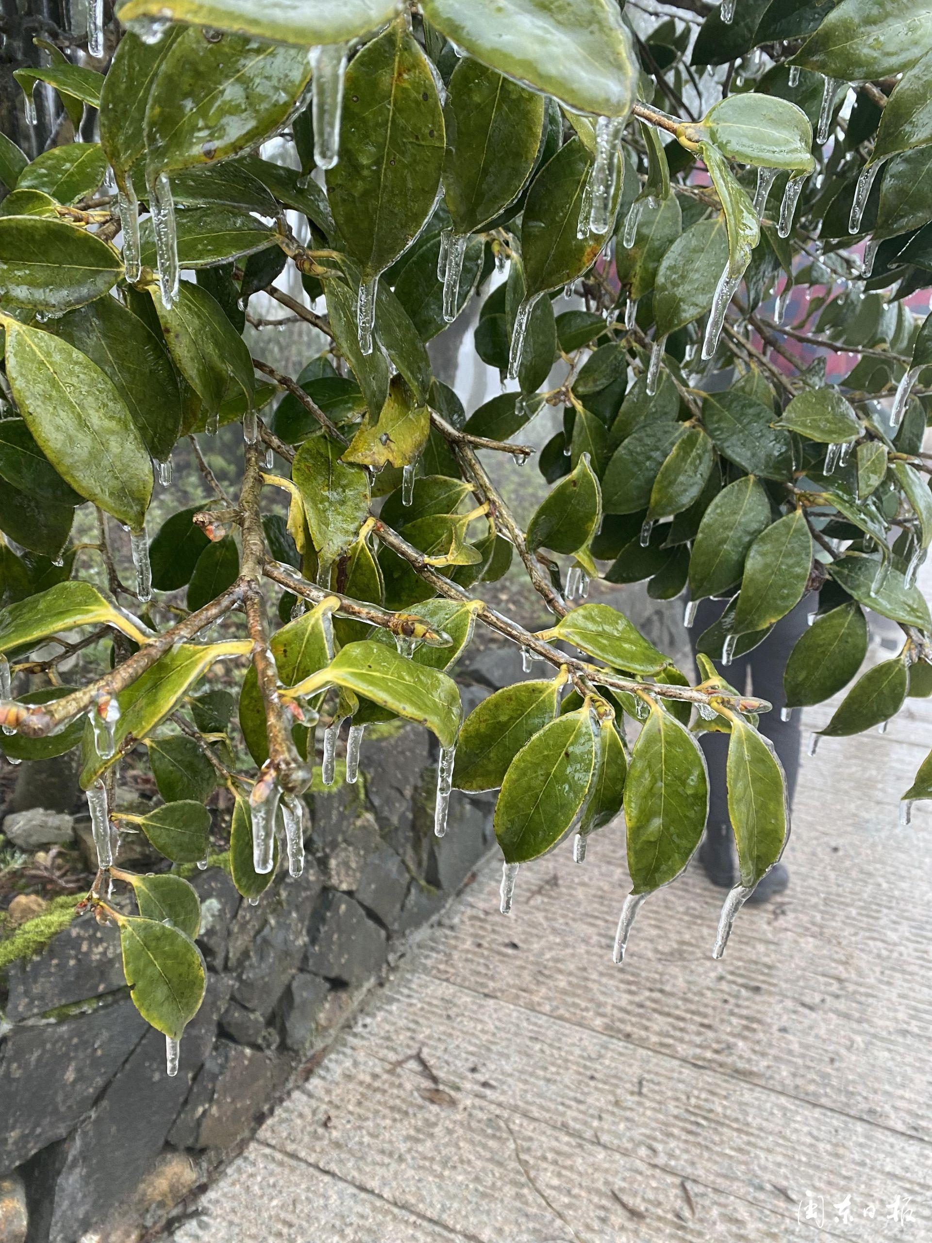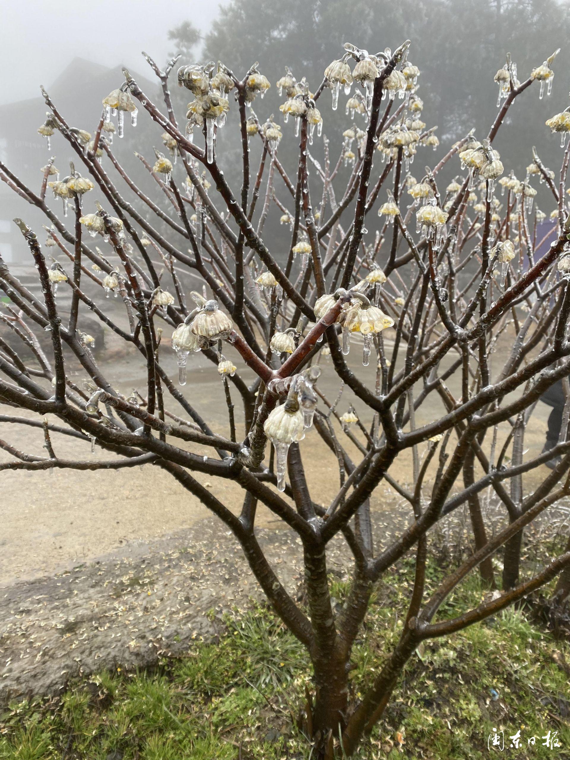 刚结出的花苞、翠绿可人的新叶,目之所及皆是银装素裹,树上挂满了亮晶晶的银条儿,每一根树枝都穿上了一层晶莹剔透的“冰衣”,宛如冰雕艺术品。