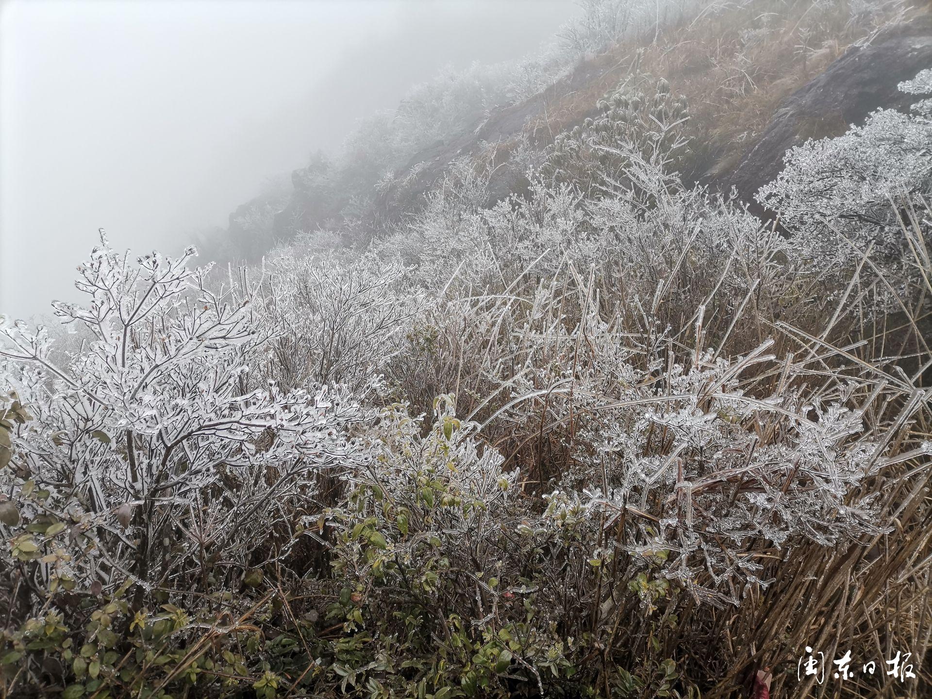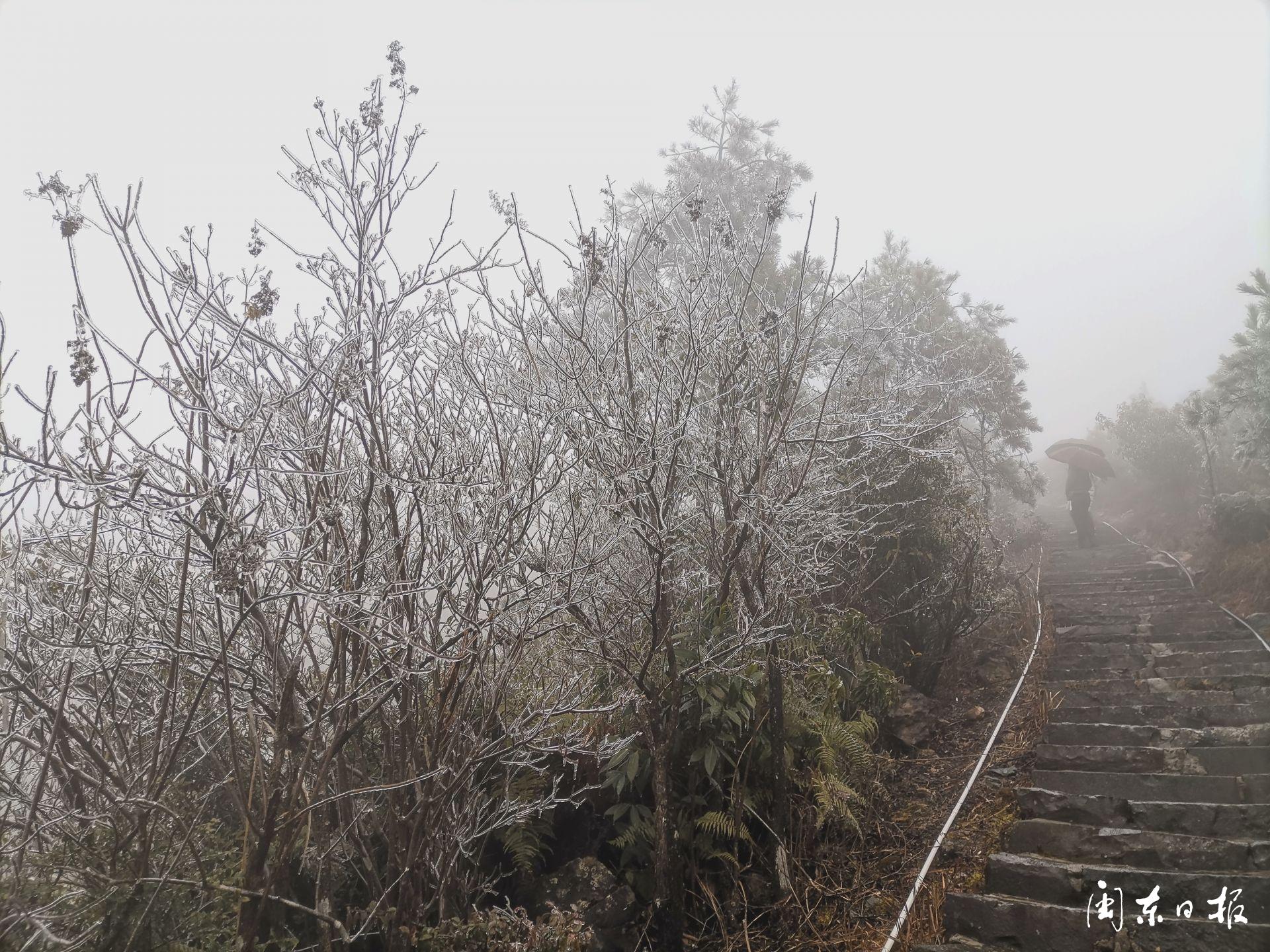 据悉,冰挂是由于冰水碰到温度等于或低于零摄氏度的物体表面时凝固形成的,需要潮湿冰冷天气才能形成。福安市文旅局工作人员介绍,今日福安气温较低,白云山上午后体感温度在0度左右,山上雾特别大,白茫茫一片,天地间一片朦胧。