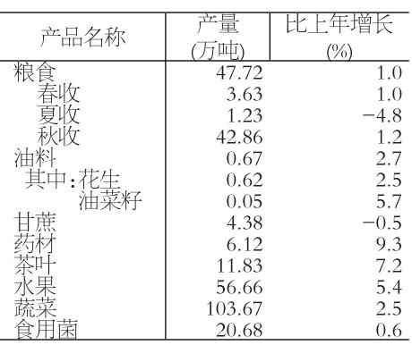 粮食播种面积134.89万亩,比上年增加0.34万亩,其中,稻谷面积87.03万亩,减少0.08万亩。蔬菜种植面积91.50万亩,增加1.26万亩;中草药材种植面积16.23万亩,增加0.8万亩;油料种植面积3.80万亩,减少0.02万亩。