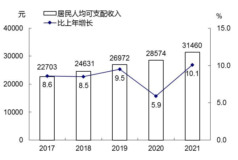 全年全市居民人均可支配收入31460元,比上年增长10.1%。按常住地分,城镇居民人均可支配收入40615元,增长9.4%;农村居民人均可支配收入21282元,增长11.7%。