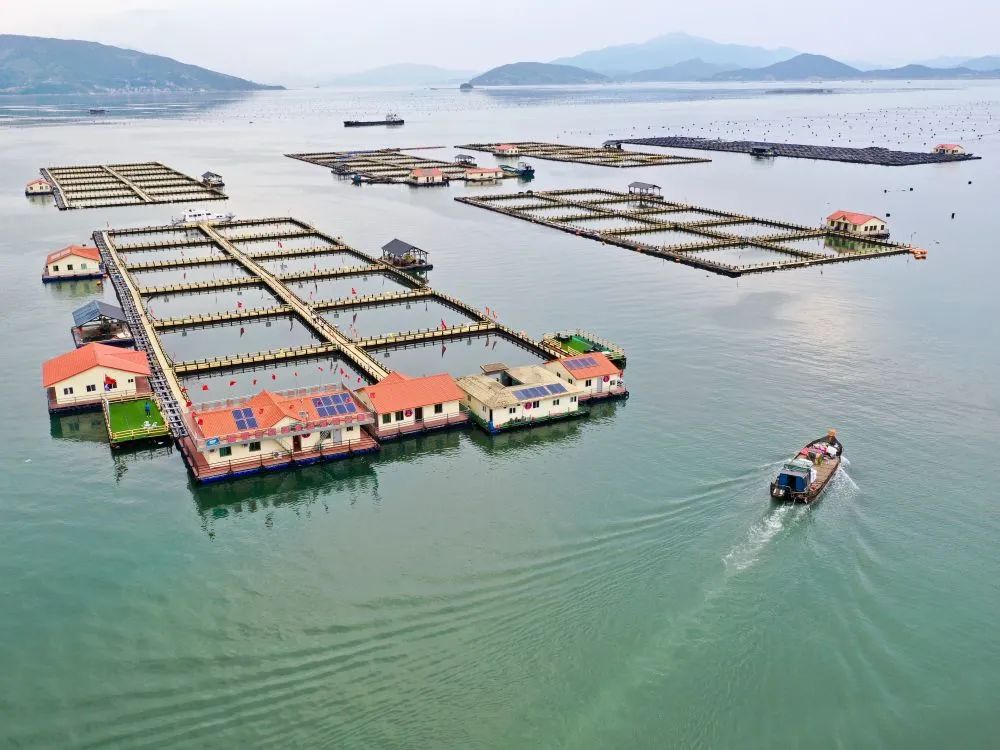 从宁德市蕉城区漳湾码头登船半小时航行,眼前是三都澳海域连片的渔排。这里是我国最大的大黄鱼养殖基地,由30多万筐养殖网箱组成的大小鱼排,将这片海域变成了辽阔的“海洋牧场”,宛如万顷“海上浮城”。